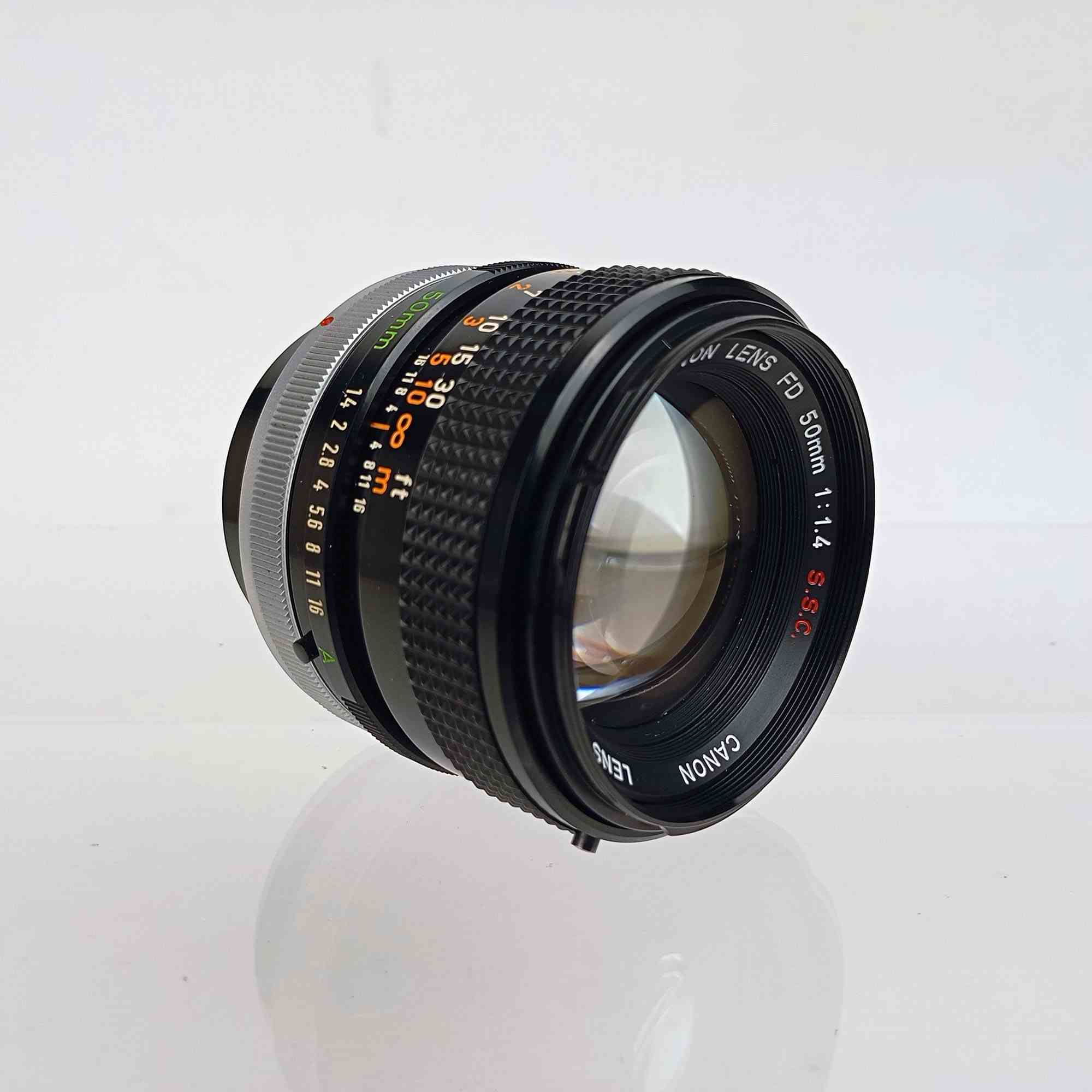 The Canon FD 50mm f/1.4 S.S.C. is a classic fast standard prime lens for the Canon FD mount. The ‘S.S.C.’ (Super Spectra Coating) designation indicates Canon’s advanced multi-layer lens coating technology of the era (mid-1970s), designed to significantly reduce flare and ghosting while improving contrast and color transmission. This lens was a step up from the standard f/1.8 and was highly popular among serious amateurs and professionals for its excellent balance of speed, sharpness, and build quality. This likely refers to the breech-lock mount version.