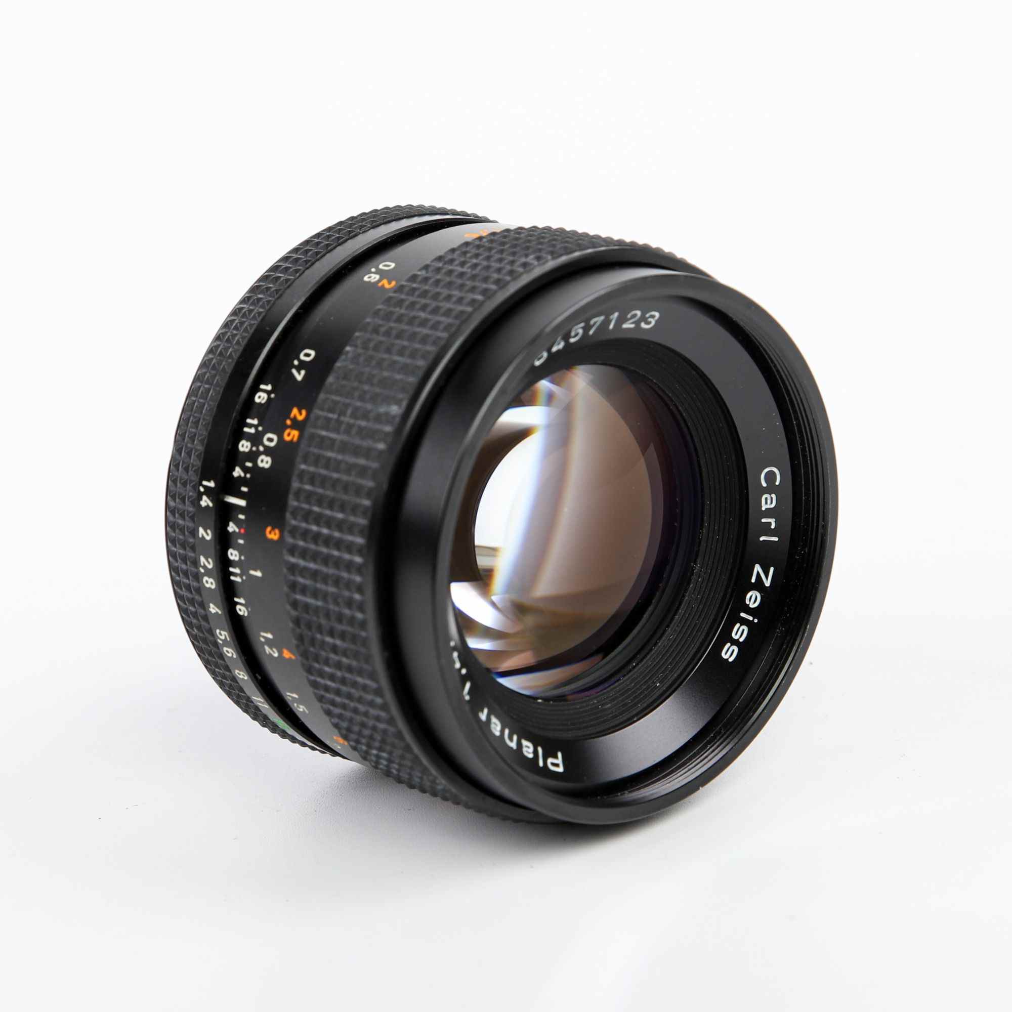 The Carl Zeiss Planar T* 50mm f/1.4 is one of the most famous and highly regarded standard lenses ever made, likely referring to the version for the Contax/Yashica (C/Y) SLR mount. Known for its exceptional sharpness, beautiful bokeh, and excellent color rendition thanks to the T* multicoating, it was a benchmark lens for decades. The Planar design (a symmetric double-Gauss derivative) provides excellent correction across the frame. It existed in both AE (earlier) and MM (later, supporting more auto modes) versions for the C/Y mount.
