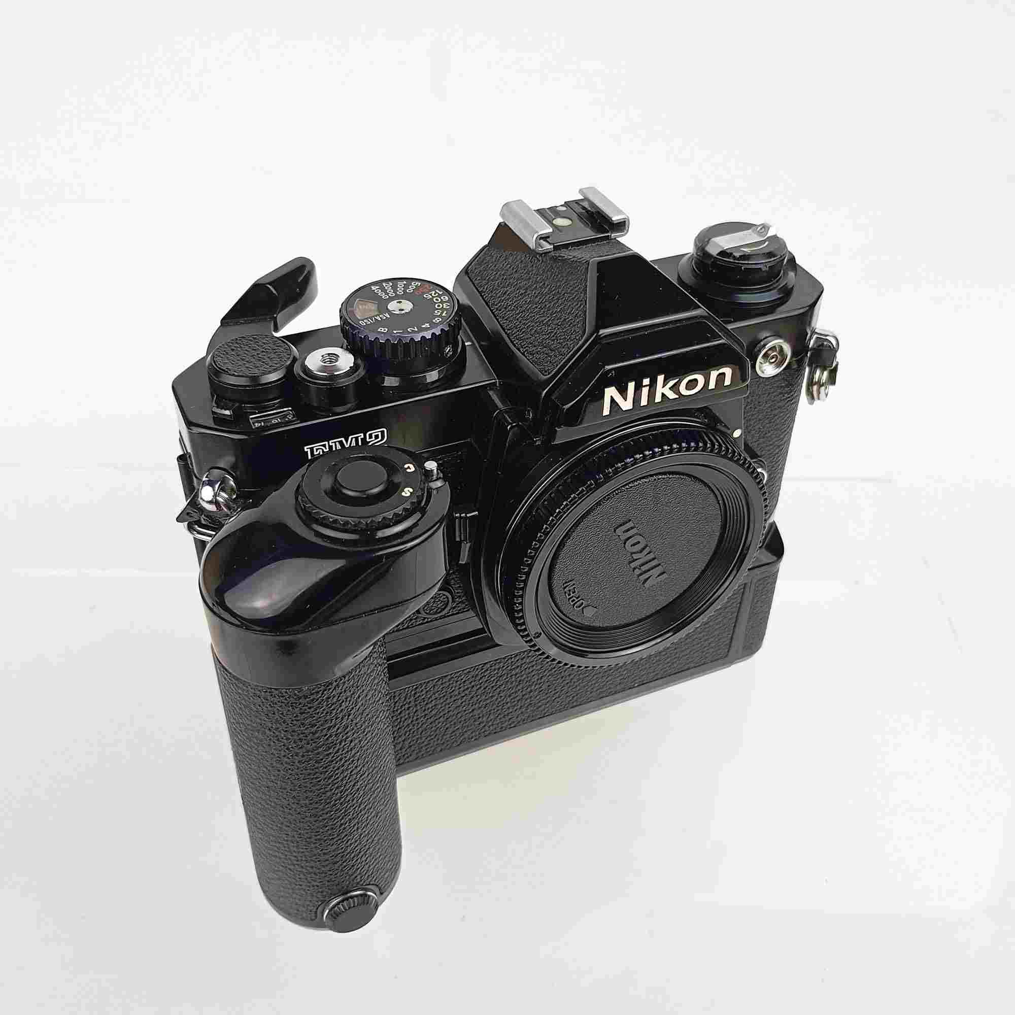 This setup pairs the legendary FM2 with a motorized MD-12 grip, giving fast film advance and rugged handling for active shooting environments.
