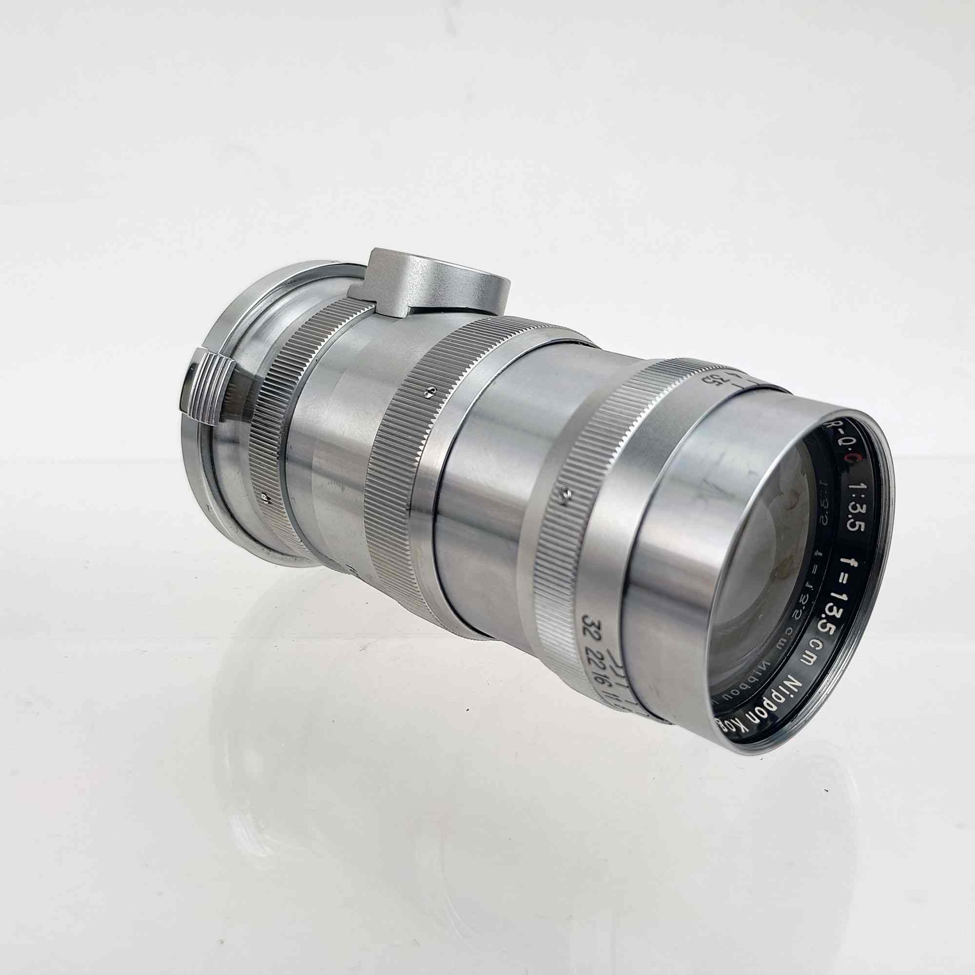 A rare telephoto lens for Nikon rangefinders, the Nikon QC 135mm F3.5 is prized for its build quality and sharp imagery. This complete set includes original caps, hood, and case, enhancing its collector value.