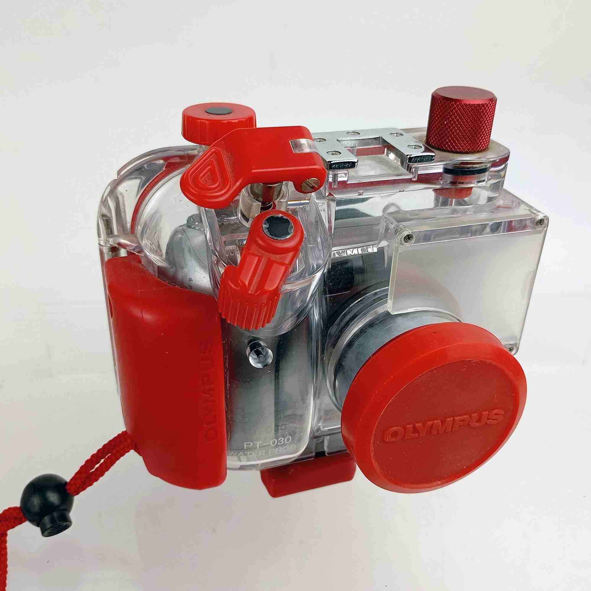 Compact digital camera from 2005 bundled with underwater housing, popular among beginner divers for its functionality.
