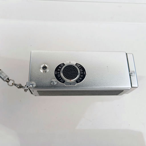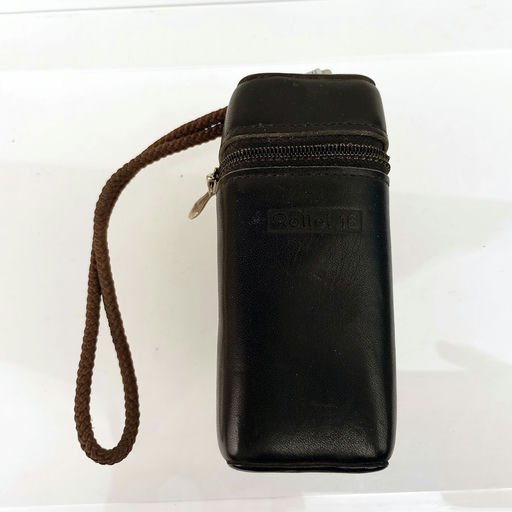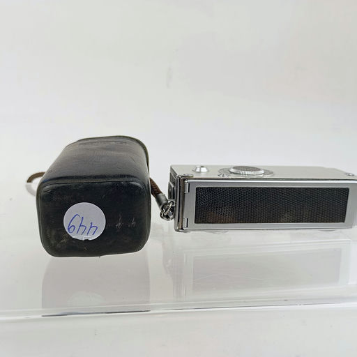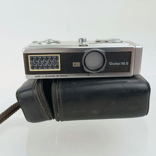 Compact subminiature Rollei 16 series camera with its original case, using 16mm film, popular with collectors.