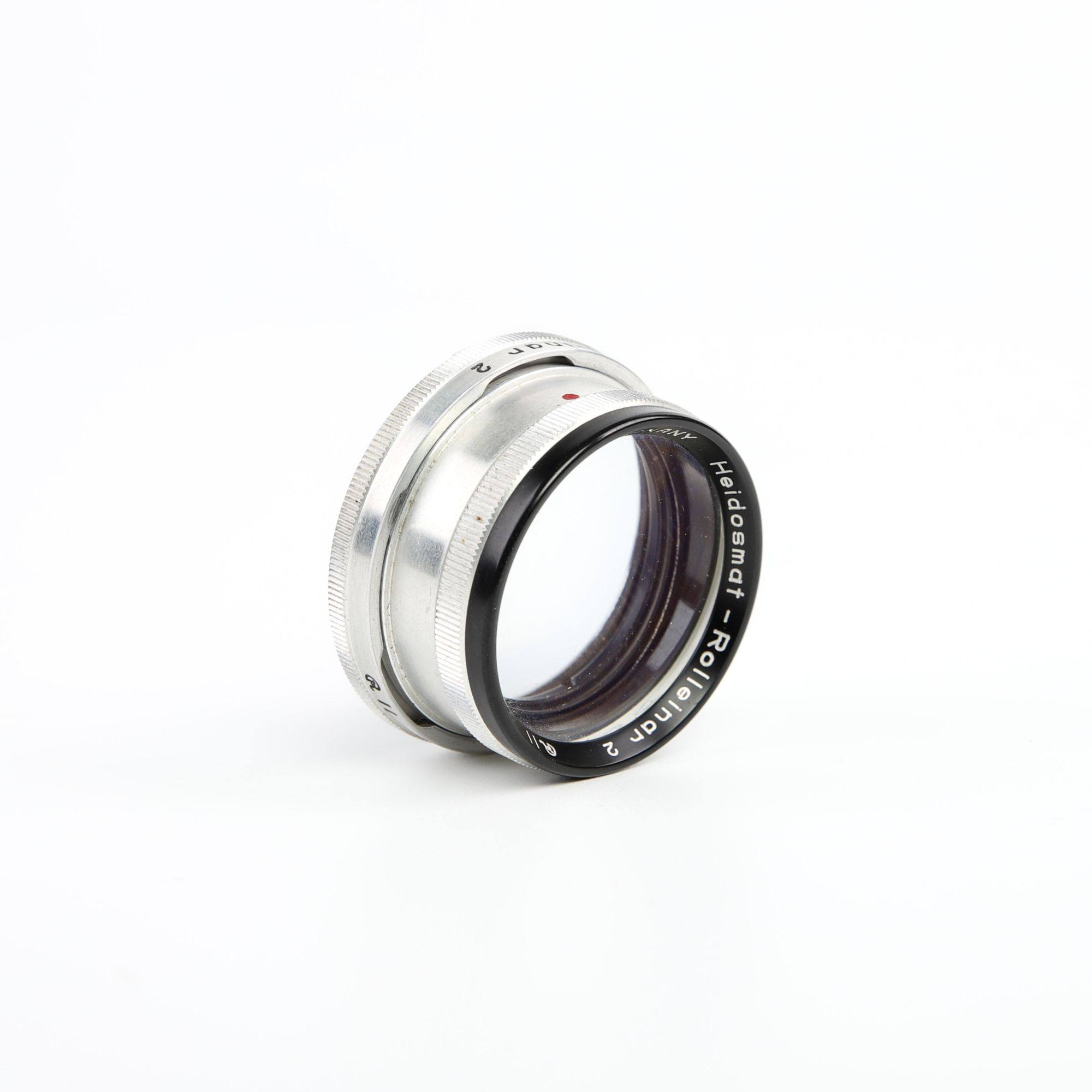 The Rolleinar-2 B-II is a mid-strength close-up lens accessory for Rolleiflex and Rolleicord cameras with Bayonet II mounts. It is used to achieve closer focusing distances and comes with a protective leather case.