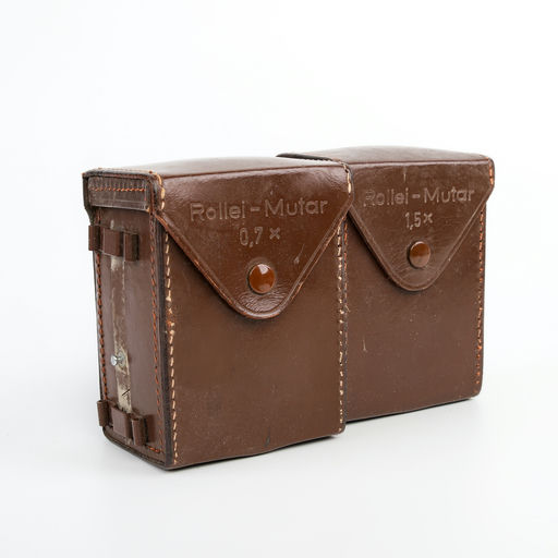 The Rollei Mutar set includes 0.7x and 1.5x auxiliary lenses for Rolleiflex TLRs, enabling wide and telephoto capabilities. These high-quality optics come in a dedicated shaded carrying case.