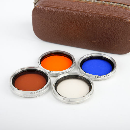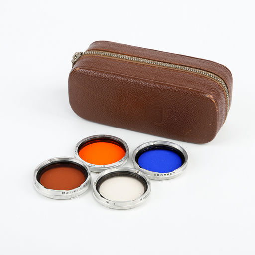 This Rollei accessory kit includes four different photographic filters, each suited to a specific lighting or film condition. These filters help enhance contrast and color fidelity, and the kit is ideal for both black-and-white and color film photography.