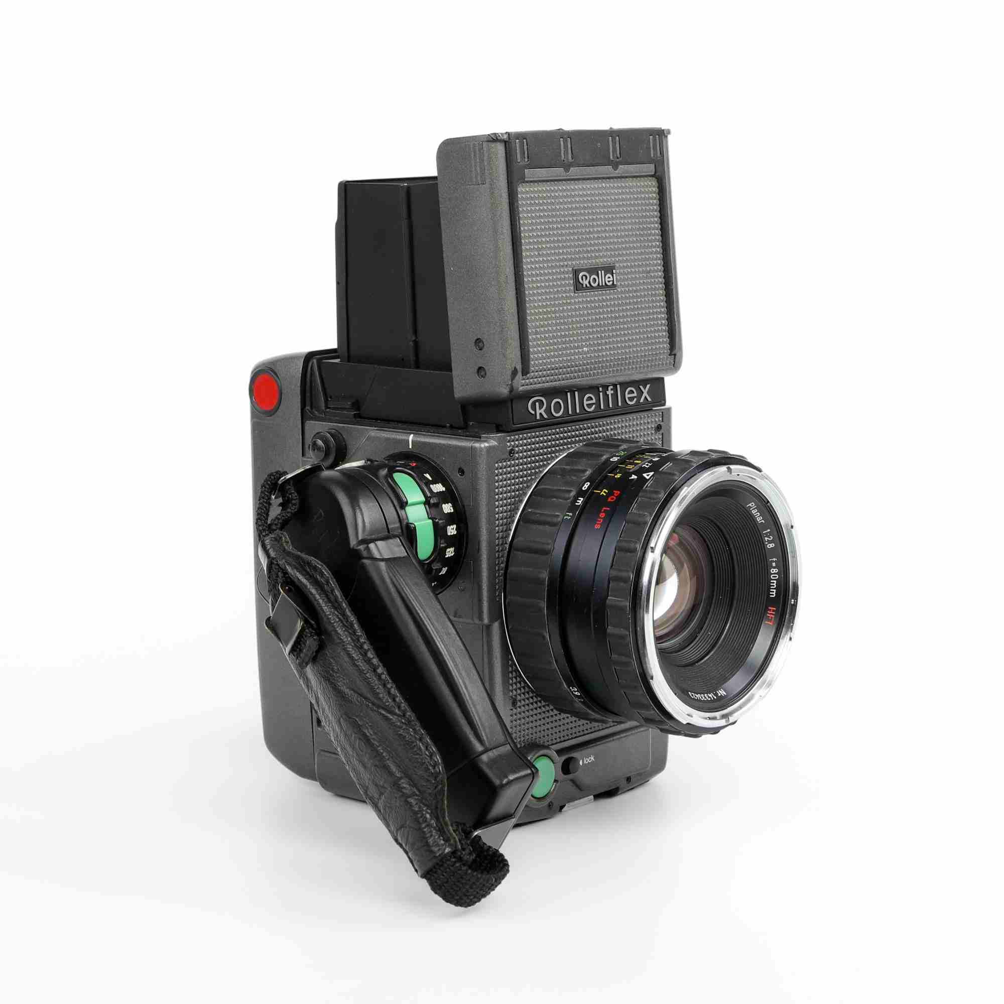 The Rolleiflex 6003 SRC 1000 is a sophisticated medium format SLR equipped with a Carl Zeiss Planar 80mm f/2.8 PQS lens. Designed for professional photographers, this model features a digital display, metering, and auto film advance.