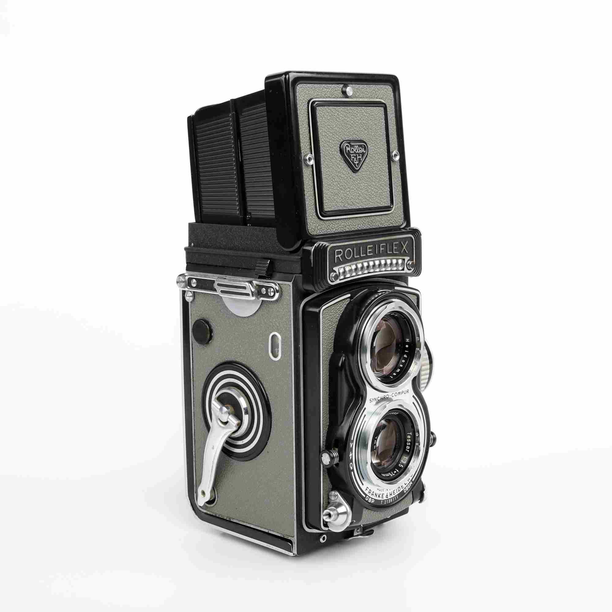 This collector-grade Rolleiflex T includes the original lens cap, leather case, and boxed packaging. The 75mm Tessar lens provides sharp and contrasty images, making it a popular model among Rolleiflex users.