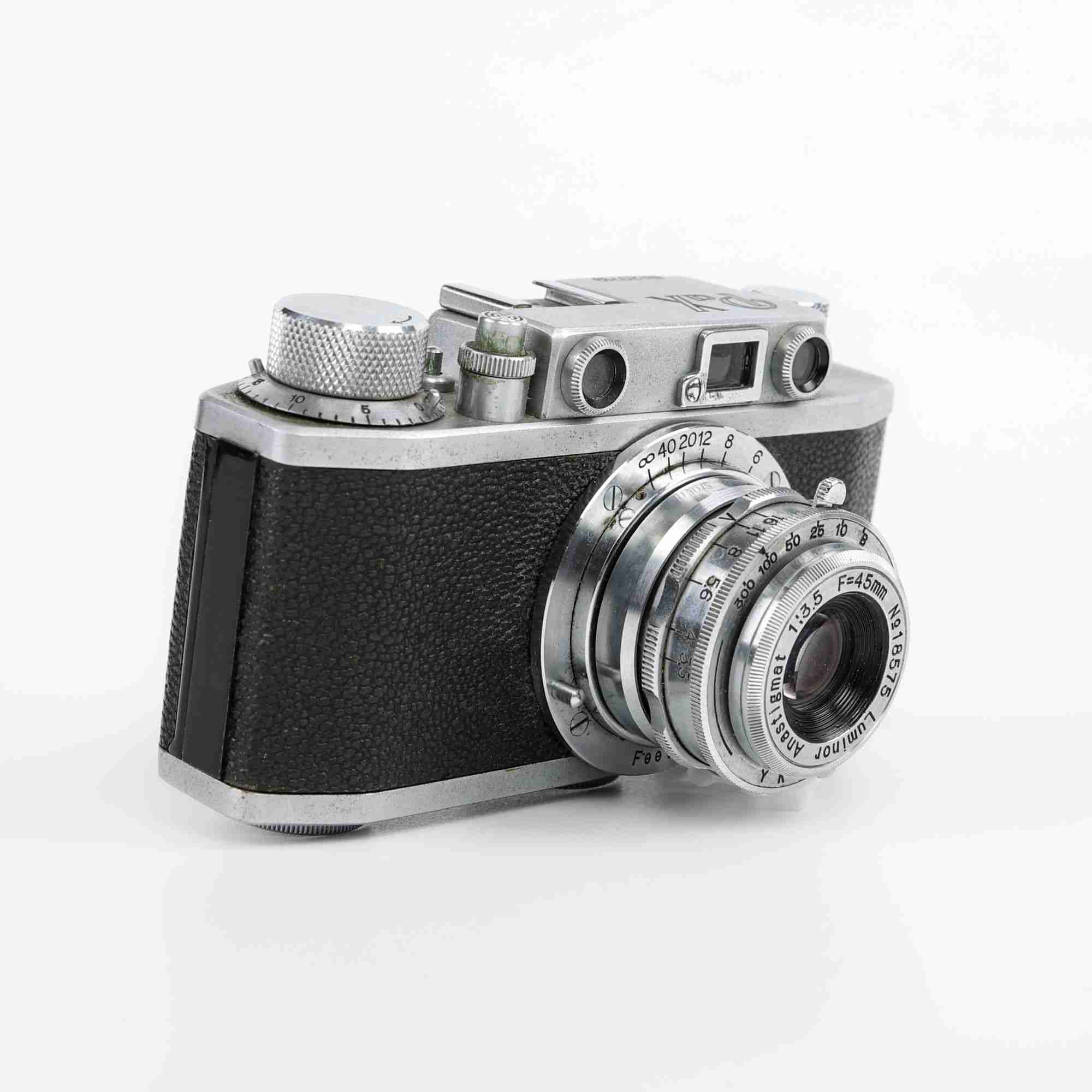 The Yamato PAX is a Japanese 35mm rangefinder featuring a sharp 45mm Luminor F3.5 lens. Known for compact design and good lens performance.