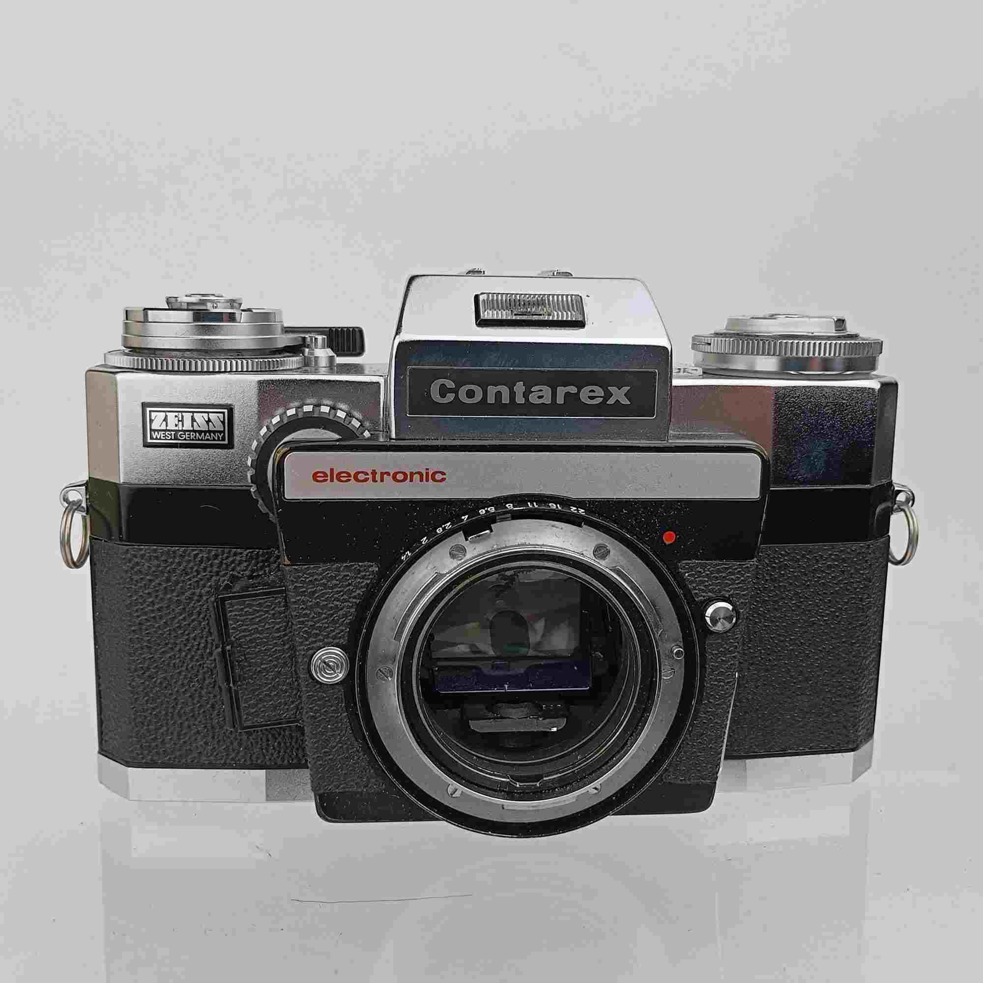 The Zeiss Contarex Electronic is a rare electronic 35mm SLR known for its precision and rugged build, paired with a Zeiss Planar lens and silver body.