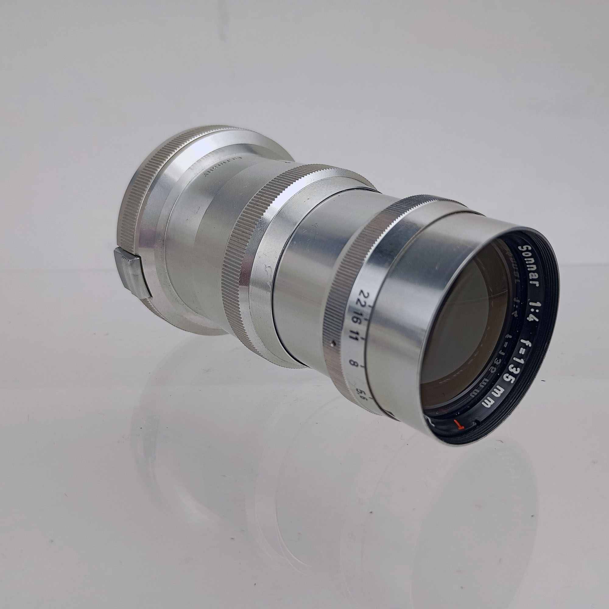 This is a Carl Zeiss Sonnar 135mm f/4 telephoto lens designed for the Contax rangefinder mount, also compatible with Soviet Kiev rangefinders which copied the Contax mount. The ‘Zeiss-Opton’ marking indicates production in West Germany (Oberkochen) shortly after WWII (late 1940s – early 1950s), before the naming disputes with East German Zeiss Jena were fully resolved. The ‘Red T’ signifies Zeiss’s single-layer anti-reflective coating applied post-war. It’s a compact, high-quality telephoto lens known for its sharpness and Sonnar rendering.